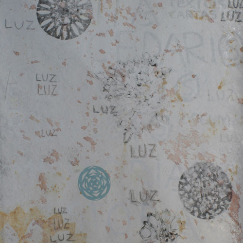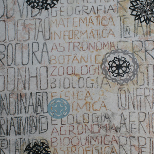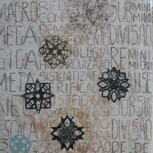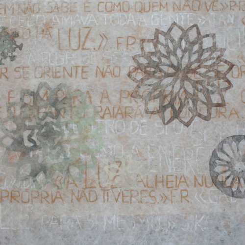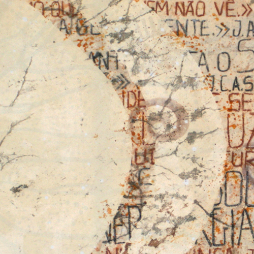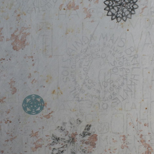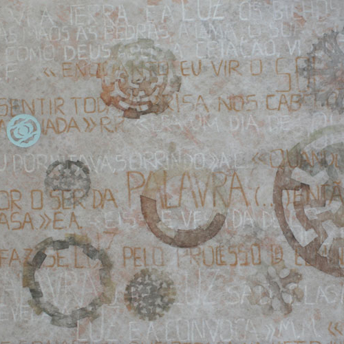 Matéria do Tempo, percorrendo tramas alinhadas numa maior ou menor densidade acrescentada para dar forma - seja cor, palavra ou símbolo, seja mancha, sentido ou carimbo, atingindo uma delicadeza aparente de um espaço que se constrói decompondo – revelando-se no processo individual e inverso da observação da geologia de tempos e sinais, de desejo de comunicar.